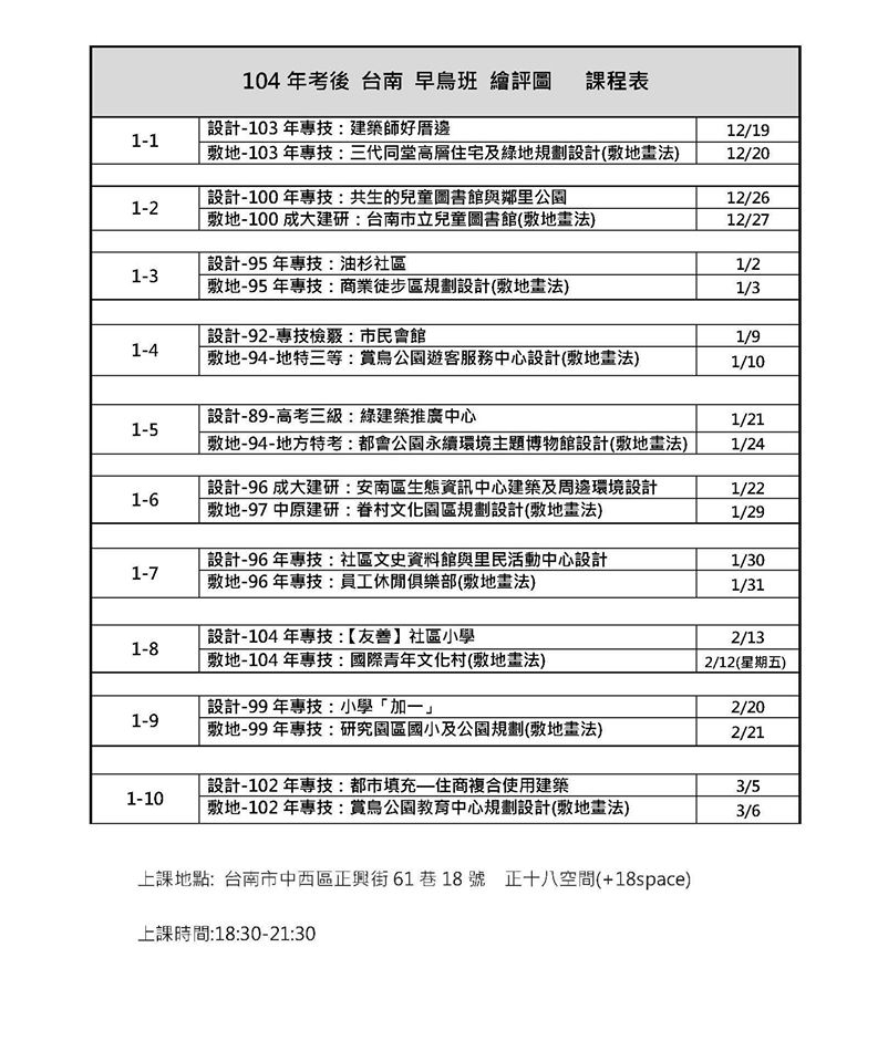 台南早鳥班課表