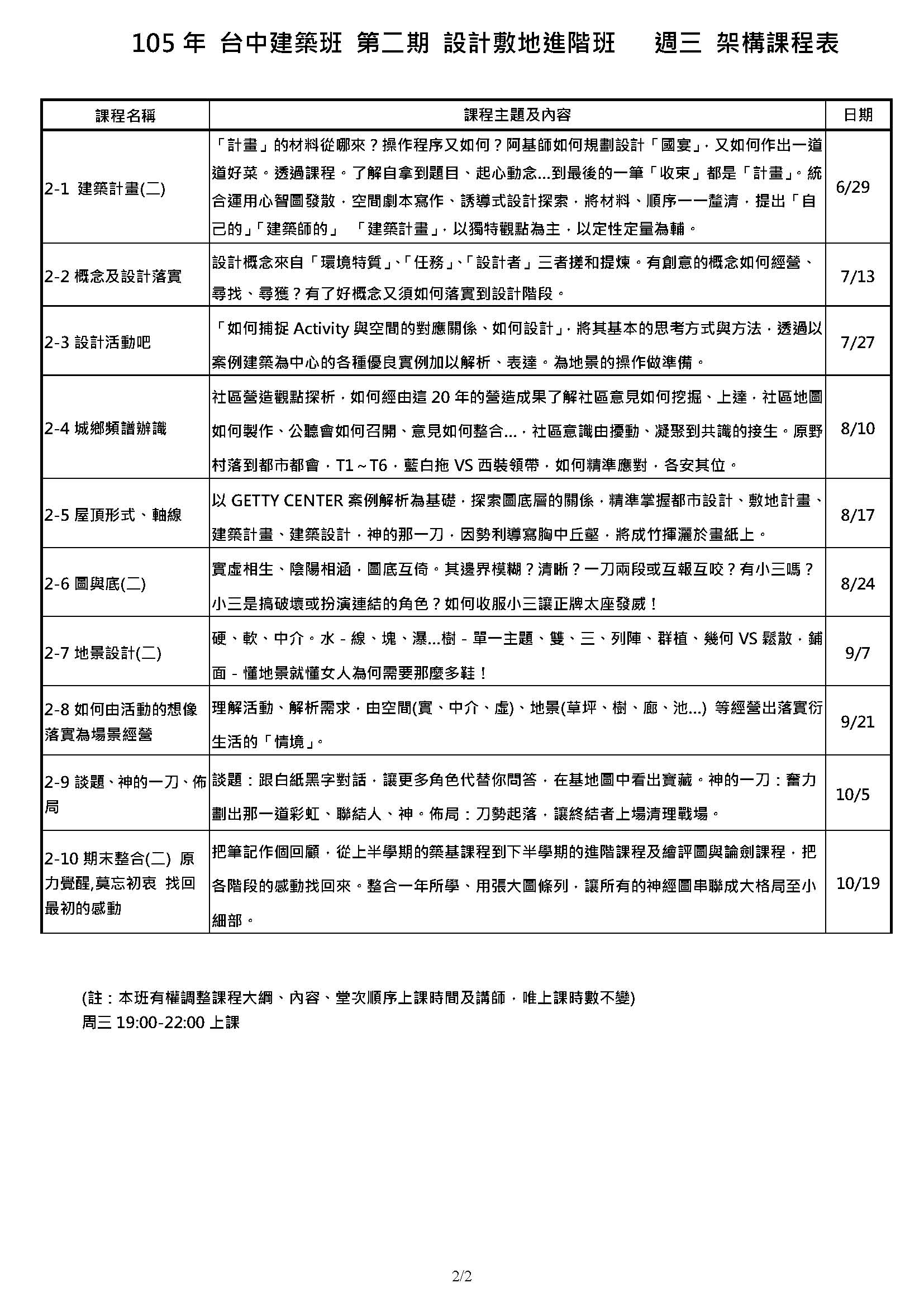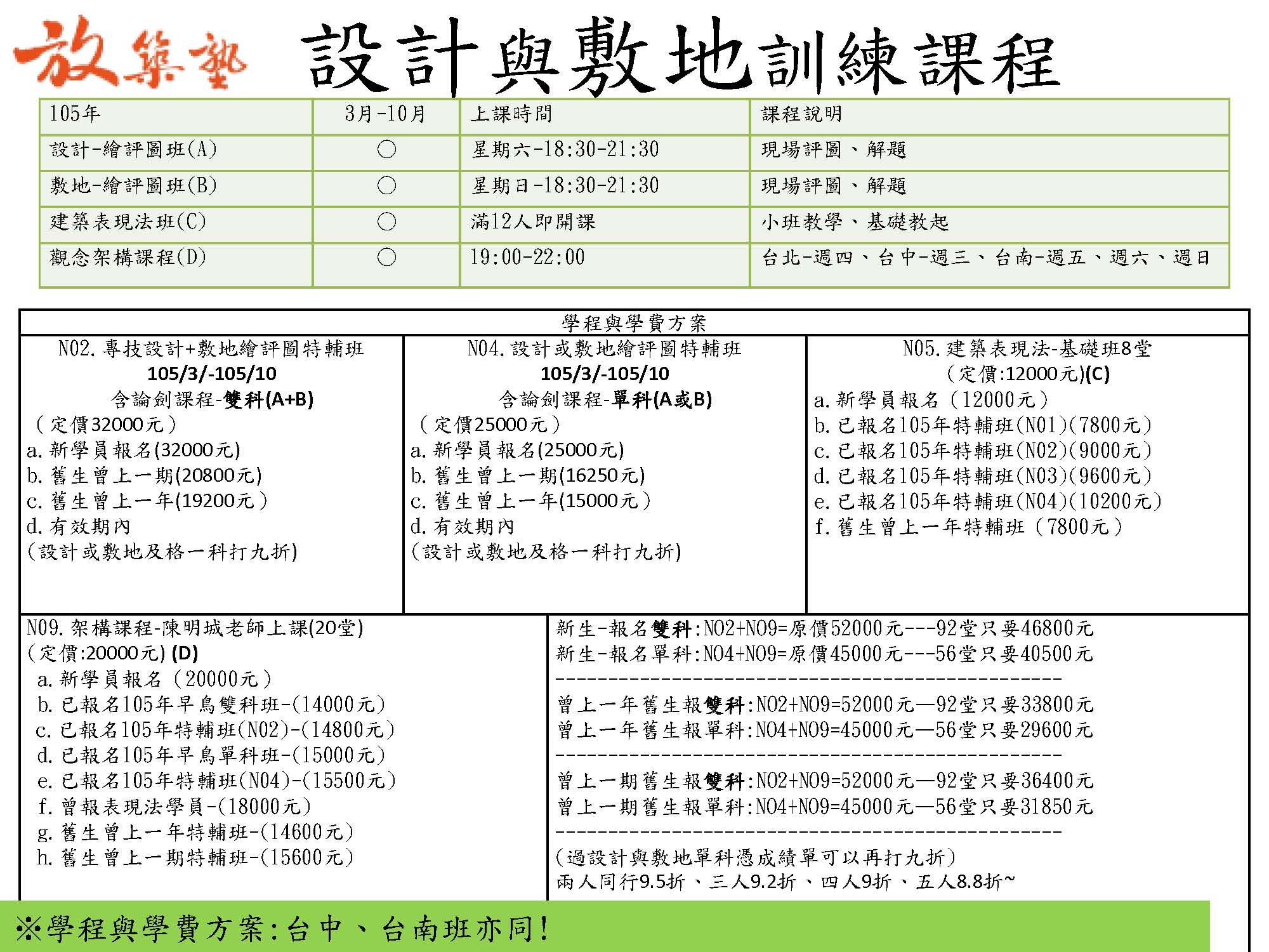 B-敷地-評圖-星期日 時間18:30-21:30 -36堂 –台北、台中、台南
