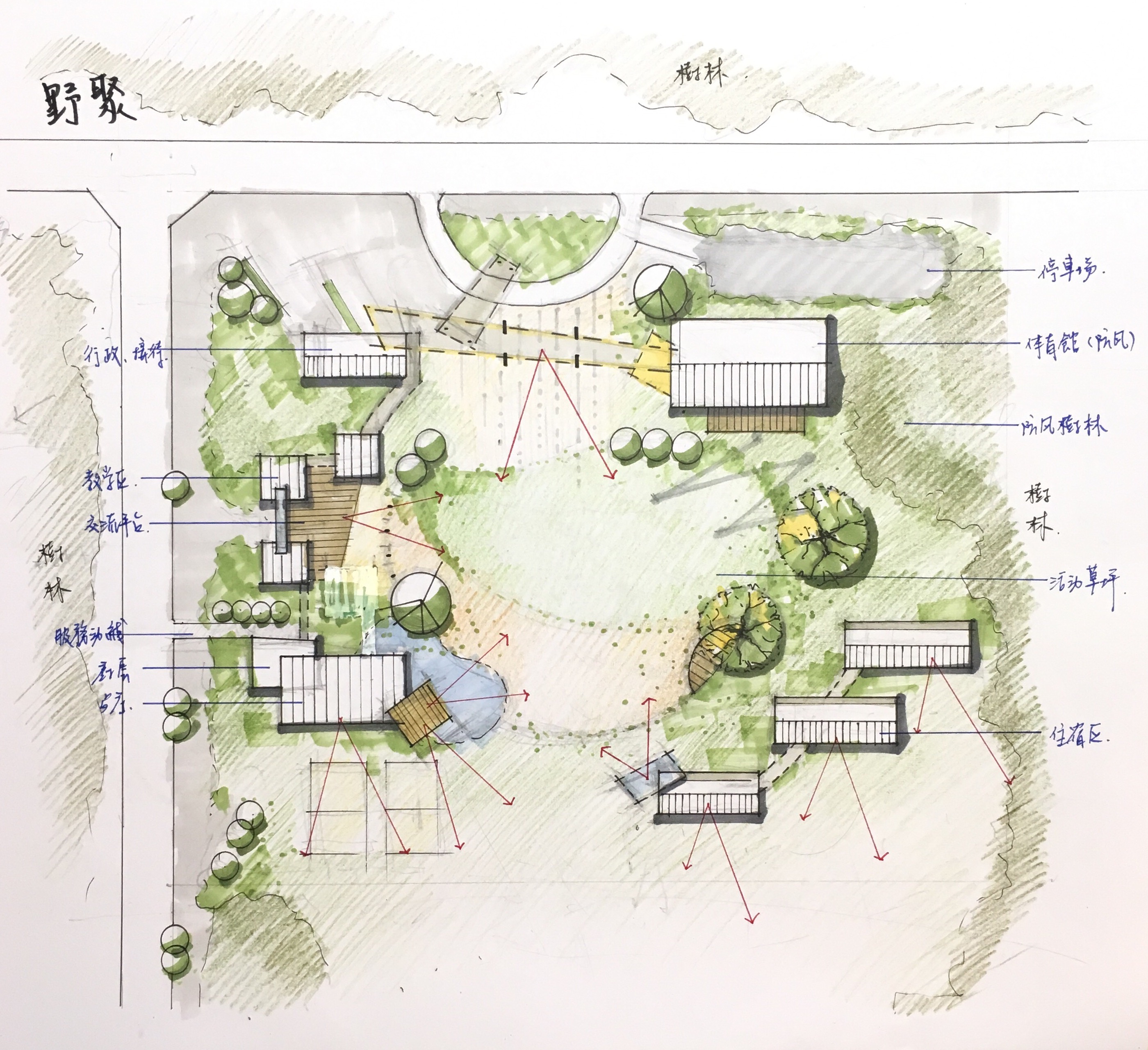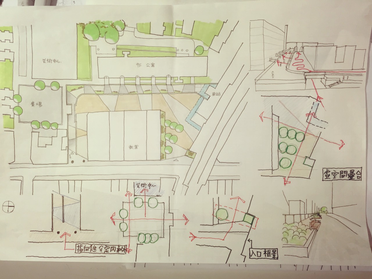 106公務高考部分:因為單一基地內的要求並不多,設計最核心的水景非常明確主導了配置的重點,於是思考時擴大到整個區域來做分期分區的發展策略,一邊想像未來各區塊陸續完工時遊客和在地居民於歷史豐富的巷弄內穿流的場景,一邊做了很簡單的安排。結果:70分