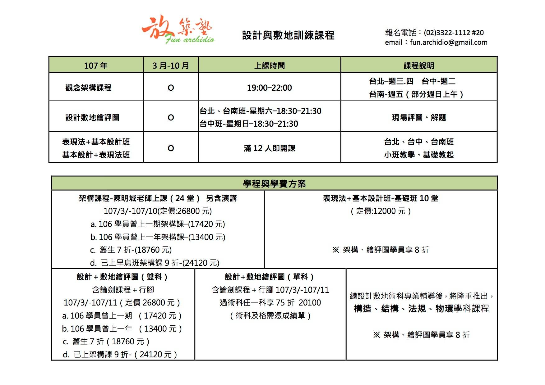 您好,經過同事推薦知道放築塾有開設術科的課程,所以想請問一些課程內容、時間及收費標準等,不知道假日有沒有可以去詢問的時間?還是有網路的資訊可以了解呢?