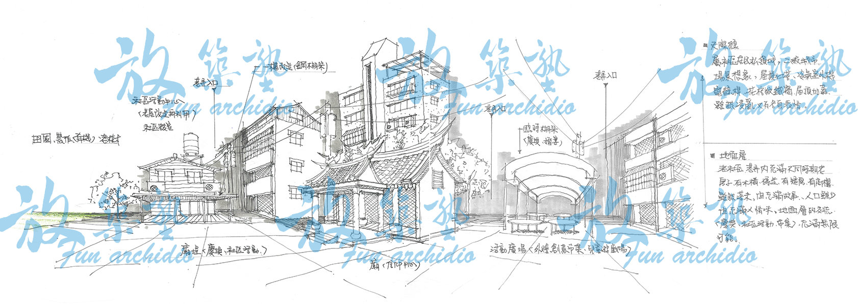 「兩天的行走坐臥還想著怎麼好好描述我經歷過的空間。除了試著儘量用紙筆取代快門,在團隊短暫的停留時刻記錄眼前所見的景色,也試著和同伴邊走邊討論所經過的場所、場所怎麼形成、樹在哪裡、怎麼圍封⋯⋯等等,這些對過去只能對這些場所在心裡留下好或不好的評語的我來說,現在有能力使這些評語和描述變得確實,甚至有能力和同伴討論。⋯⋯」—— 林瑋倫 建築師