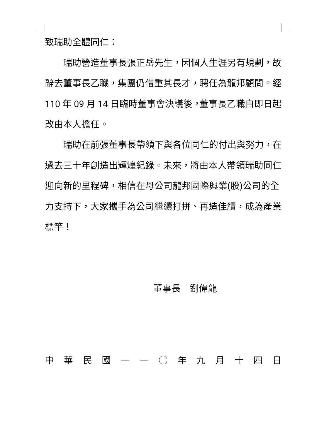 瑞助營造董事長張正岳被撤換,9月15日早上舉行告別儀式,與主管抱頭痛哭,哭成一團!