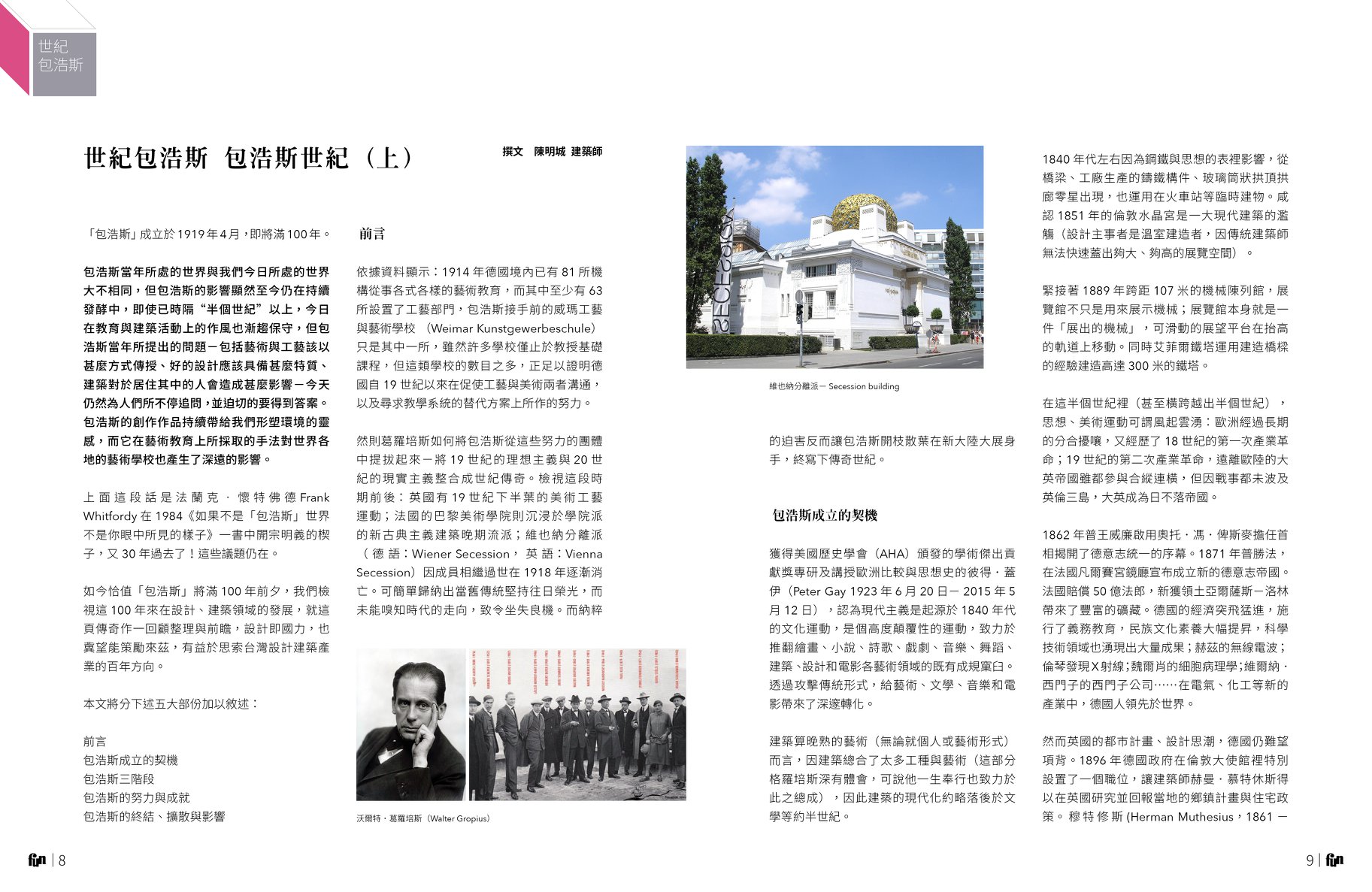 然則葛羅培斯如何將包浩斯從這些努力的團體中提拔起來--將19世紀的理想主義與20世紀的現實主義整合成世紀傳奇。檢視這段時期前後:英國有19世紀下半葉的美術工藝運動;法國的巴黎美術學院則沉浸於學院派的新古典主義建築晚期流派; 維也納分離派(德語:Wiener Secession,英語:Vienna Secession) 因成員相繼過世在1918年逐漸消亡。可簡單歸納出當舊傳統堅持往日榮光,而未能嗅知時代的走向,致令坐失良機。而納粹的迫害反而讓包浩斯開枝散葉在新大陸大展身手,終寫下傳奇世紀。值此包浩斯創校將滿百週年前夕,我們樂於檢視這一頁傳奇,也冀望能策勵來茲,有益於思索台灣設計、建築產業的百年方向。
