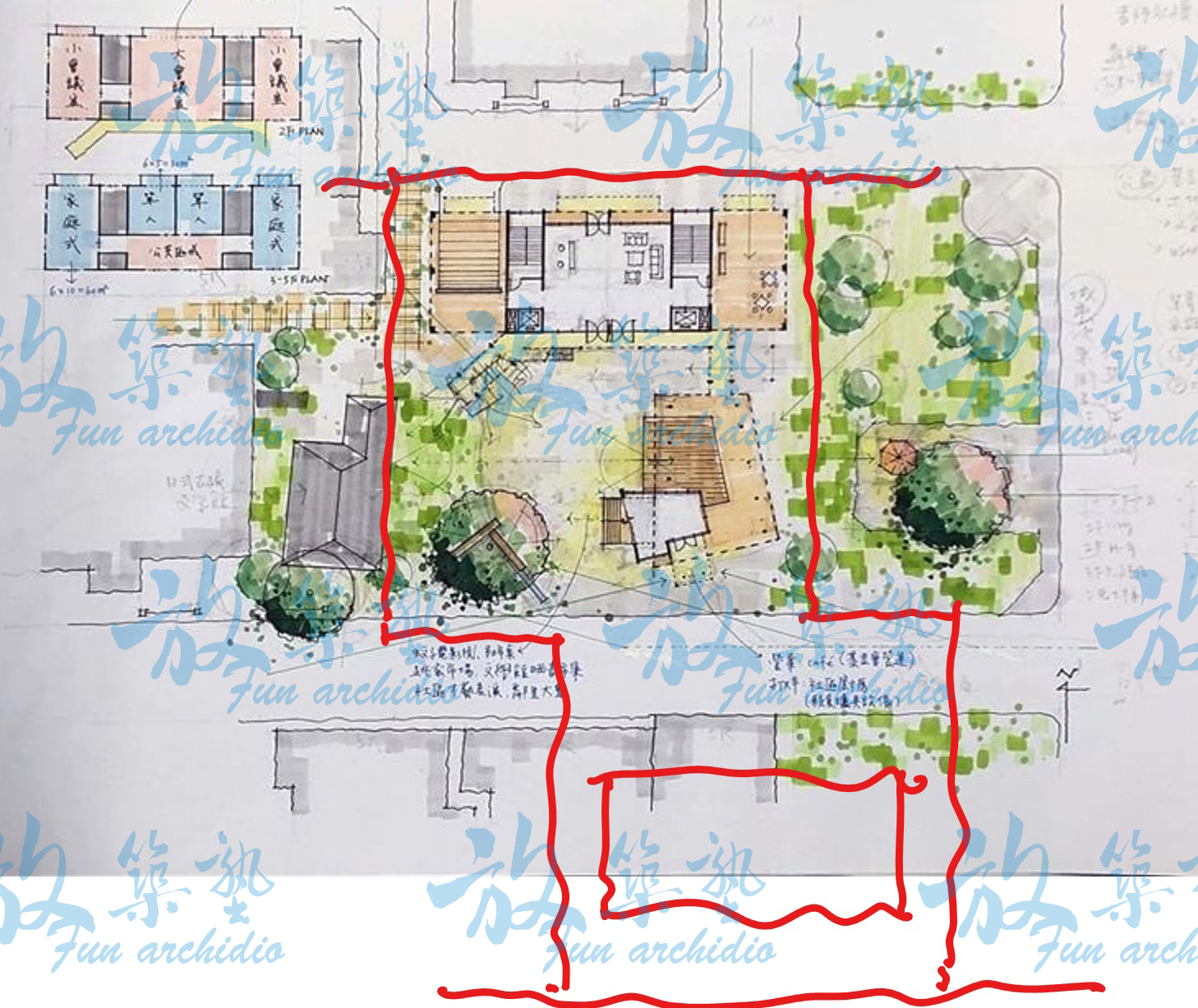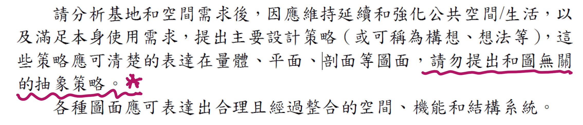 真的很感謝有遇到你,這次一拿到設計題目,心中竊喜,怎麼好康題目連樹都幫我種好了,王在哪裡也很明顯…我只要把三角的另外兩角補上,南北貫通就行了,很悠哉的度過了這八個小時,第一次考試異常的一點緊張的心情都沒有,反倒是前面的同學不停嘆氣解不出題,左邊的把出租宿舍單元狂塞猛塞,典型的「畫到流汗、被嫌到流涎」。另外題目說勿作囈語,確實我旁邊的,我看他設計敷地都畫一樣,應該就是出題老師不想看到的類型,我沒有受過其他補習班的洗禮,心中自然沒有框架,加上經過架構課案例解析磨練,計畫部分也不成問題。唯一美中不足就是我依然畫太慢,交卷前很多部分還停留在鉛筆稿,只有配置的部分上了針上了色。